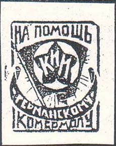 1930(?) г. Разм. 37 x 47 мм. Одноцветная печать на желтоватой бумаге. В прямоугольной рамке с закругленными краями в центре комсомольский значок. Сверху текст: «На помощь». Внизу продолжение текста в две строки: «Германскому Комсомолу».