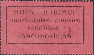 1930(?) г. Разм. рамки 46 x 22 мм. Одноцветная печать на желтоватой бумаге. Зубц. 11 1/2. В пря-моугольной рамке в центре текст в четыре строки: \tузникам капитала – комсомольцам».