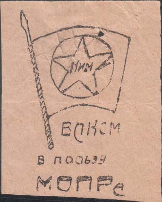 1930(?) г. Разм. 50 х 70 мм. Одноцветная печать низкого качества на гладкой светло-оранжевой бумаге. В центре комсомольский значок. Внизу текст в три строки: «ВЛКСМ в пользу МОПРа».