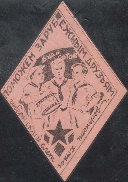 1926(?) г. Ромб разм. 77 х 100 мм. Одноцветная печать на плотной розовой бумаге. В ромбовидной рамке разм. 66 х 93 мм в центре трое пионеров с барабаном. Сверху флаг с текстом: «Будь готов». Внизу пятиконечная звезда. По внутреннему периметру рамки текст: «Поможем зарубежным друзьям. Губернский с…