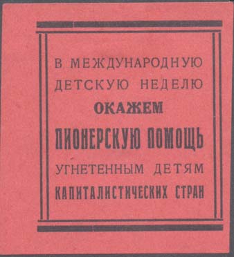 1930(?) г. Разм. 55 х 62 мм. Одноцветная печать на бумаге различных цветов. В центре в прямо-угольной рамке разм. 44 х 51 мм текст в шесть строк: «В международную детскую неделю окажем пионерскую помощь угнетенным детям капиталистических стран».