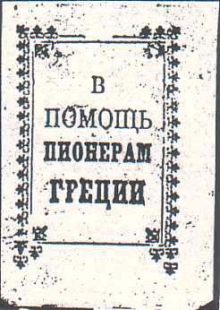 1930(?) г. Разм. 35 x 50 мм. Одноцветная печать на желтоватой бумаге. В прямоугольной декоративной рамке разм. 22 x 33 мм в центре текст в четыре строки: «В помощь пионерам Греции».