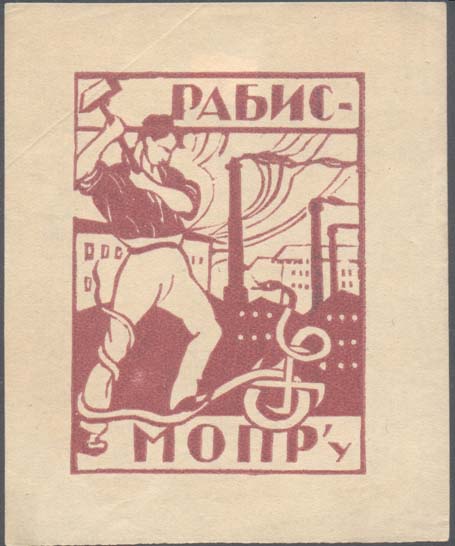 1930(?) г. Разм. 75 х 91 мм. Одноцветная печать на кремовой бумаге. В центре в прямоугольной рамке разм. 49 х 68 мм аллегорический рисунок: на фоне индустриального пейзажа рабочий бьет молотом змею, обвивающую свастику и ногу рабочего. Текст: «РАБИС - МОПРу».