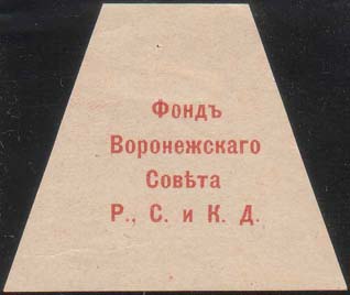 1917 г. Виньетка в форме трапеции разм. 53 х 44 мм. Одноцветная печать на желтоватой бумаге. В центре текст в четыре строки: «Фонд Воронежского Совета Р.,С. и К.Д.».