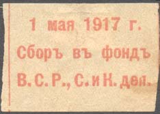 1917 г. 01.05.1917 г. Разм. 37 х 27 мм. Одноцветная печать на тонкой желтоватой бумаге. В центре текст в три строки: «1 мая 1917 г. Сбор в фонд В.С. Р,С. и К. деп[утатов].». Сверху разграничительная линия.