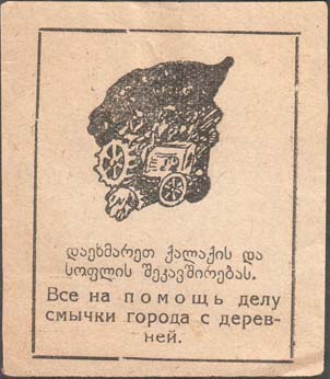 1932(?) г. Разм. 50 х 58 мм. Одноцветная печать желтоватой бумаге. В прямоугольной рамке разм. 40 х 50,5 мм в центре эмблема общества смычки: трактор на фоне знамени. Внизу текст в пять строк, на русском и грузинском языках: «Все на помощь делу смычки города с дерев-ней».