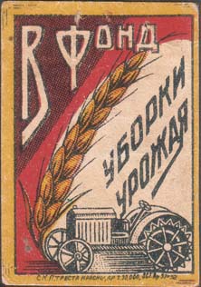 1929(?) г. Разм. 37 х 58 мм. Трехцветная печать на кремовой бумаге. В прямоугольной рамке разм. 33,5 х 43 мм в центре колос, трактор и текст в три строки: «В фонд уборки урожая». Под рамкой выходные данные мелким шрифтом: «СКП треста Краснодар т.30.000 ОСТ. Ар 37 х 52».