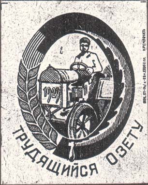 1929 г. Разм. 51 х 63 мм. Одноцветная печать на желтоватой бумаге. В двойной овальной рамке разм. 41 х 51 мм из серпа и колоса тракторист на тракторе с датой на радиаторе «1929». Внизу под рамкой полукругом текст: «Трудящийся Озету». Справа вертикально выходные данные мелким шрифтом: «Окрл. 171-…