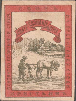 1922(?) г. Разм. 52 х 69 мм. Двухцветная печать на бежевой бумаге. В двойной прямоугольной рамке разм. 47 х 63 мм пахарь на фоне деревни. Сверху лента с текстом: «Сейте сознание в дерев[не].». По периметру между рамками текст: «Сбор на пропаганду среди крестьян основного политическ[ого]. строя».