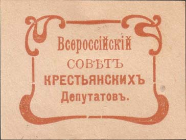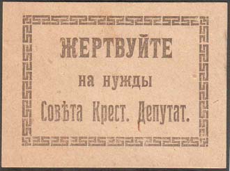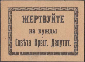 1917(?) г. Разм. 56 х 40 мм. Одноцветная двухсторонняя печать на желтоватой бумаге. На лицевой и оборотной стороне в центре в прямоугольных декоративных рамках разм. 45 х 31,5 мм текст в три строки: «Жертвуйте на нужды Совета Крест[ьянских]. Депутат[ов].».