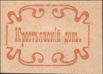 1923(?) г. Разм. 61 х 44 мм. Одноцветная печать на бежевой бумаге. В декоративной рамке разм. 49 х 36 мм текст: «Крестьянский день».