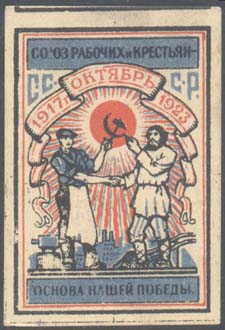 1923 г. Разм. рамки 33 х 48 мм. Трехцветная печать на кремовой бумаге. В центре в двойной прямо-угольной рамке рабочий и крестьянин держат серп и молот на фоне восходящего солнца с лучами. Внизу наковальня и плуг, на заднем плане завод. Сверху на ленте текст: «1917 г. Октябрь 1923». Сверху текст …