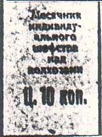 1932 г. Разм. 27 х 42 мм. Одноцветная печать на бумаге различных цветов. В центре текст в шесть строк: «Месячник индивидуального шефства над колхозами». Внизу номинал: «Ц[ена]. 10 коп.».