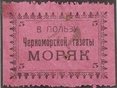 1923 г. 23.09.1923 г. Разм. рамки 33 х 22 мм. Одноцветная печать на розово-малиновой бумаге. Нерегулярная зубц. В центре в прямоугольной рамке декоративной рамке текст в три строки: «В пользу Черноморской газеты «Моряк»». По углам цифры номинала.