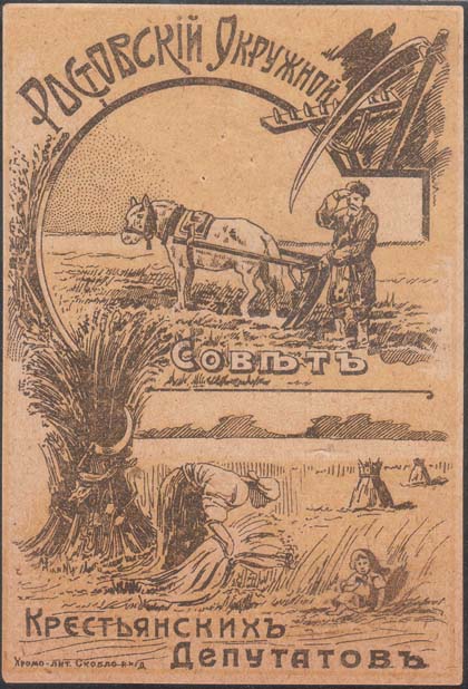 1919(?) г. Разм. 73 х 101 мм. Двухцветная печать на кремовой бумаге. В центре скрещенные лопата, грабли и винтовка в обрамлении колосьев. Сверху текст в четыре строки: «В пользу Совета Крестьянских депутатов Ростовского округа». Внизу пахарь в поле.