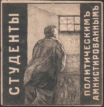 1917(?) г. Разм рамки 57 х 59 мм. Одноцветная печать на белой бумаге. В центре заключенный в камере стоит у окна. Слева вертикально текст: «Студенты». Справа вертикально продолжение текста в две строки: «Политическим амнистированным».
