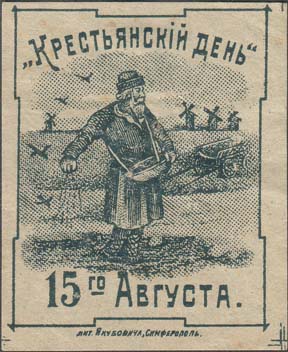 1917 г. 15.08.1917 г. Разм. 48 х 59 мм. Одноцветная печать на бумаге различных цветов. В центре в прямоугольной рамке разм. 42,5 х 53,5 мм с декоративными уступами крестьянин с лукошком, сеющий зерно. На заднем фоне ветряные мельницы. Сверху полукругом текст: ««Крестьянский день»». Внизу дата: «15…