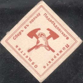 1915 г. Ромб разм. 46 х 46 мм. Одноцветная печать на толстой белой бумаге. В двойной рамке в форме ромба разм. 40 х 40 мм в центре скрещенные пожарные топоры и каска пожарного. По внутреннему периметру рамке текст: «Сбор в пользу Подобедовского Пожарного общества».