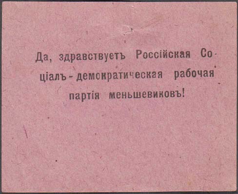 1917 г. Разм. 81 х 67 мм. Одноцветная печать на розовой бумаге. Текст в три строки: «Да, здравствует Российская Социал-демократическая рабочая партия меньшевиков!».