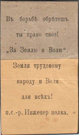 1917 г. Разм. 45 х 77 мм. Одноцветная печать бумаге, склеенной из двух частей серо-зеленоватой и желто-серой. Сверху текст в три строки: «В борьбе обретешь ты право свое! «За Землю и Волю»». Внизу текст в четыре строки: «Земля трудовому народу и Воля для всех! П.с.-р. Иженер[ого]. полка».