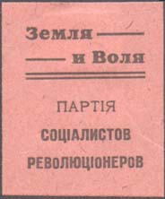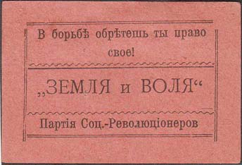 1917 г. Разм. 58 х 38 мм. Одноцветная печать на светло-розовой бумаге. В центре прямоугольной рамке разм. 47 х 27 мм в центре текст: ««Земля и воля»». Сверху текст в две строки: «В борьбе обретешь ты право свое!». Внизу текст: «Партия социалистов-Революционеров».
