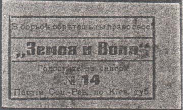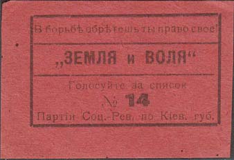 1917 г. Разм. 57 х 38 мм. Одноцветная печать на темно-розовой бумаге. В центре прямоугольной рамке разм. 47 х 27 мм в центре текст: ««Земля и воля»». Сверху текст: «В борьбе обретешь ты право свое!». Внизу текст в три строки: «Голосуйте за список №14 Партии Соц[иалистов].-Рев[олюционеров]. По Ки-…