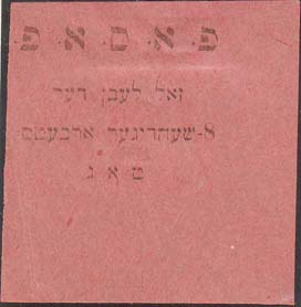 1917 г. Разм. 45 х 45 мм. Одноцветная печать на розово-красной бумаге. Сверху аббревиатура на идиш. В центре текст в три строки на идиш.