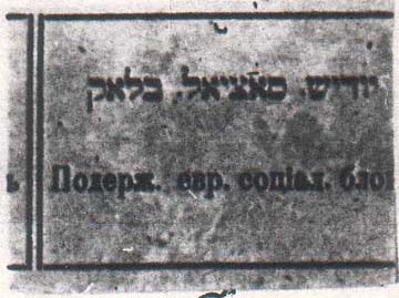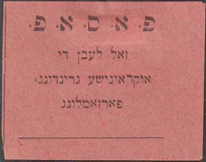 1917 г. Разм. 50 х 39 мм. Одноцветная печать на розово-красной бумаге. Сверху аббревиатура на идиш. В центре текст в три строки на идиш. Слева и внизу разграничительные линии.
