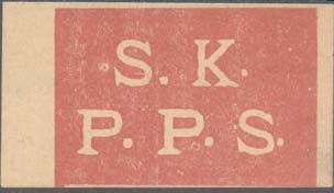 1917 г. 03.09.1917 г. Разм. 52 х 28 мм. Одноцветная печать на желтоватой бумаге. На сплошном фоне аббревиатура на польском языке: «S.K. Р.Р.S.».