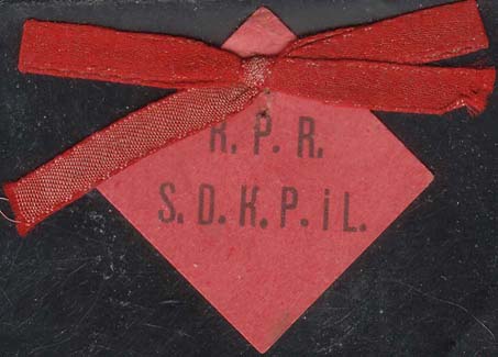 1917 г. Ромб разм. 40 х 40 мм. Одноцветная печать на розовой бумаге. В центре аббревиатура на польском языке в две строки: «K.P.R. S.D.K.Р.IL.». Сверху бант из тонкой красной материи.
