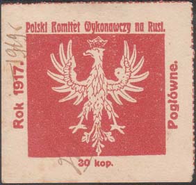 1917 г. Одноцветная печать на желтоватой бумаге. На лицевой стороне в центре на сплошном прямоугольнике разм. 34 х 30 мм герб Польши – одноглавый орел.