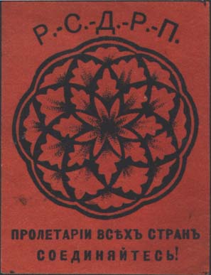 1917 г. 18.04.1917 г. Двухцветная и трехцветная печать на сероватой бумаге. В центр декоративный элемент из растительного орнамента. Сверху полукругом аббревиатура «Р.-С.-Д.-Р.-П.».