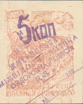 1930 г. Фиолетовая надпечатка номинала «5 коп.» и названия организации в семь строк: «НКТ Жмеринская межведомственная детская оздоровительная комиссия. Ю.-З.Ж.Д. ...192... №...». На знаках предыдущего выпуска.