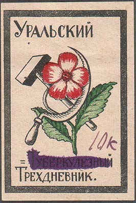 1932(?) г. Знаки предыдущего выпуска с закрашенным фиолетовыми чернилами словом «туберкулезный» и нанесенным от руки номиналом.