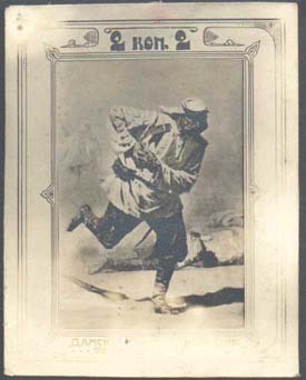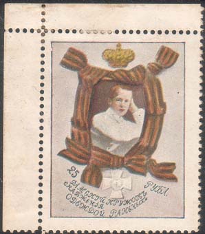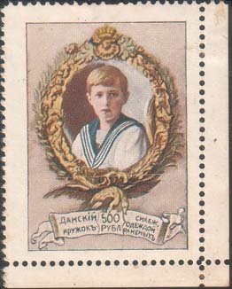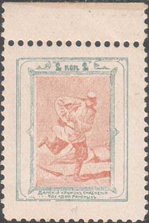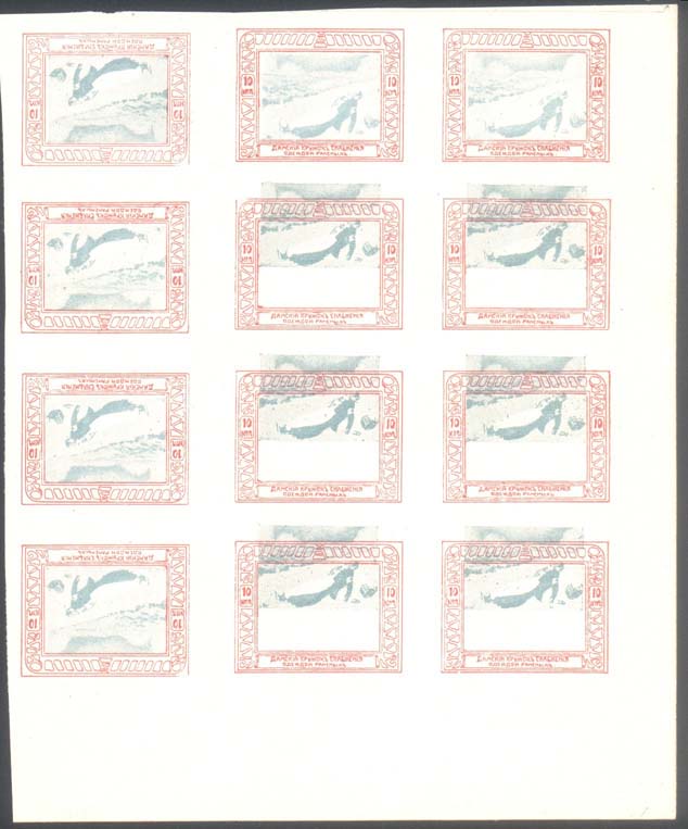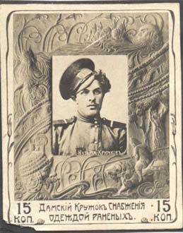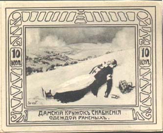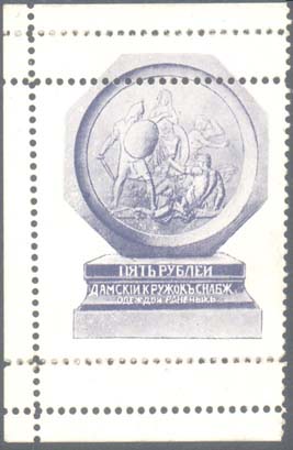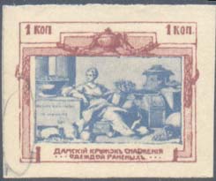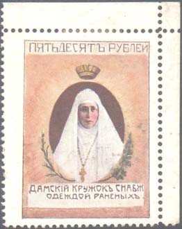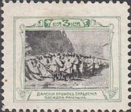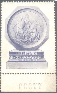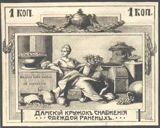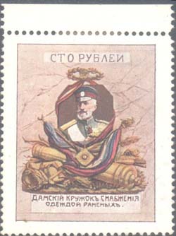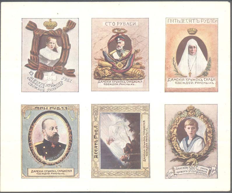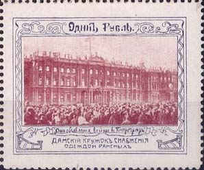 1914 г. Двухцветная и многоцветная печать бумаге различного качества. Зубц. 11 1/2. и Б.З. С клеем и без клея. В прямоугольной рамке в центре раз-личные сюжеты. Текст: «Дамский кружок снабжения одеждой раненых».