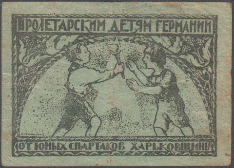 1926(?) г. Разм. 84 х 61 мм. Одноцветная печать на бумаге различных цветов. В прямоугольной декоративной рамке разм. 71,5 х 49,5 мм на фоне пятиконечной звезды один ребенок передает факел другому. Сверху текст: «Пролетарским детям Германии». Внизу продолжение текста: «От юных Спартаков Харьковщины». В левом нижнем углу текст мелким шрифтом: «С. Уманский».