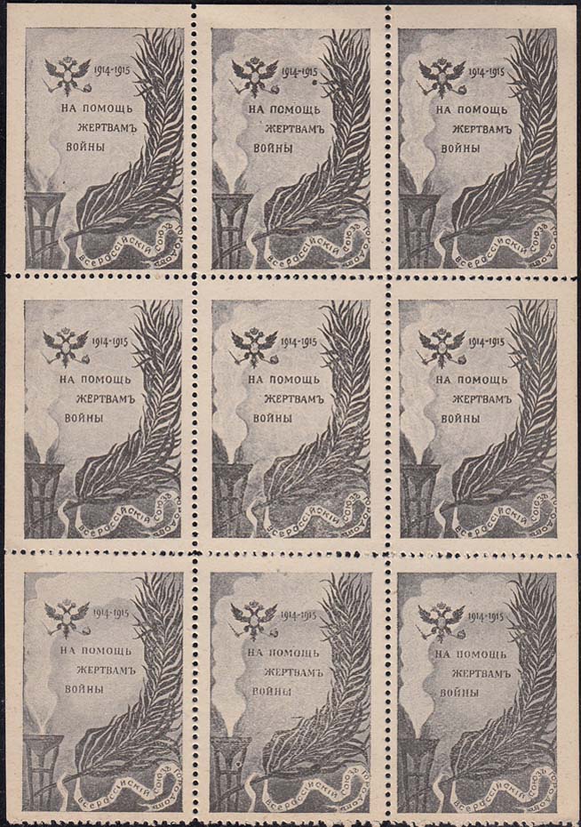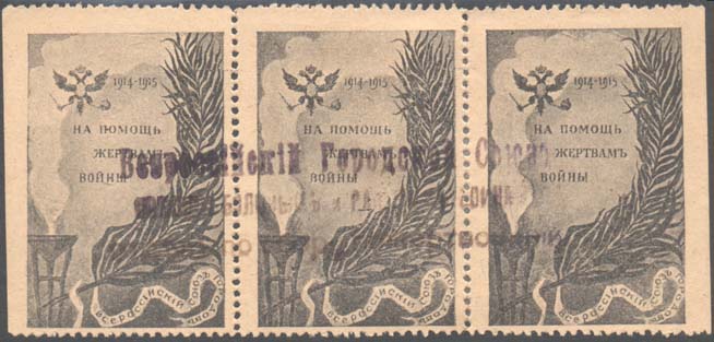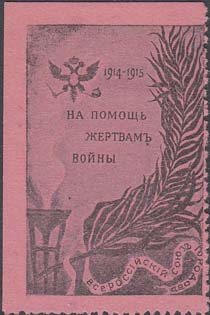 1914 г. Разм. 30 х 45 мм. Одноцветная печать на бумаге различных цветов. Зубц. 11 1/2 и Б.З. В центре двуглавый орел и текст в четыре строки: «На помощь жертвам войны 1914 – 1915 г.». Справа внизу светильник и пальмовая ветвь с лентой. На ленте текст: «Всероссийский Союз Городов».