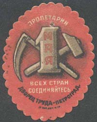 1930(?) г. Овал разм. 32 х 41 мм. Трехцветная печать на плотной белой бумаге. В центре на фоне скрещенных косы и молота крупная цифра «1». На цифре вертикально текст: «Мая». Сверху и снизу текст: «Пролетарии всех стран, соединяйтесь!». Ниже полукругом текст: «Дворец труда. Петроград». Внизу полукругом мелким шрифтом выходные данные: «1-я гос. Лит. П-ГР.».