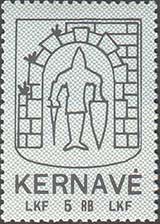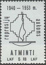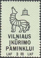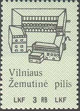 1990 г. Разм. по перфорации 26 х 37 мм. Двухцветная печать на белой бумаге. Зубц 12 1/2 х 12. С клеем. На сплошном сетчатом фоне в изображение различных объектов культуры Литвы. Тексты на литовском языке. Внизу аббревиатура на литовском языке «ЛКФ» и номинал.