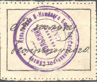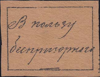 1925(?) г. Разм. 56 х 45 мм. Одноцветная печать на бумаге различных цветов. В прямоугольной рамке разм. 49 х 33 текст от руки: «В пользу беспризорных».