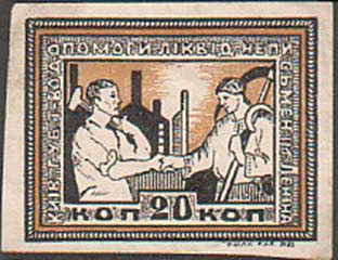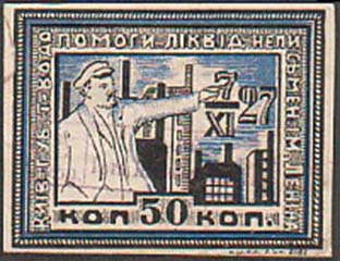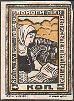 1925 г. Двухцветная печать на белой бумаге. В прямоугольной декоративной рамку различные сюжеты. По внутреннему периметру рамки текст на украинском языке: «Киев[ское]. Губ[ернское]. О-во помощи ликвид[ации]. неграмотности им. Ленина». Внизу номинал. Внизу под рамкой выходные данные мелким шриф-том неразборчиво.