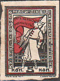 | Красноармеец со знаменем на фоне индустриального пейзажа и лучей восходящего солнца. На полотнище знамени текст на украинском языке в две строки: «Долой неграмотность». | |||||||