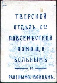 1916(?) г. Разм. 32 х 49 мм. Одноцветная двухсторонняя печать на бумаге различных цветов. На лицевой стороне в центре различные сюжеты. По перимет-ру текст: «Жертвуйте на теплую одежду и белье нашим защитникам». На оборотной стороне текст в семь строк: «Тверской отдел О-ва Повсеместной Помощи Больным и Раненым Воинам».