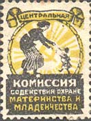 1923(?) г. Разм. 31 х 25 мм. Одноцветная и двухцветная печать на белой (оттенки) бумаге. С нере-гулярной просечкой и зубц. 11 1/2. С клеем. В центре в круглой декоративной рамке женщина, протягивающая руки ребенку на фоне серпа и молота и лучей восходящего солнца. Сверху на ленте текст: «Центральная». Внизу в фигурной рамке текст в четыре строки: «Комиссия содействия охране материнства и младенчества».