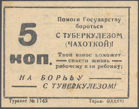 1924 г. Август. Разм. 74 х 56 мм. Одноцветная двухсторонняя печать на тонкой желтоватой бумаге. На лицевой стороне в прямоугольной рамке разм. 68 х 49 м слева номинал. Справа текст в семь строк: «Помоги Государству бороться с туберкулезом (чахоткой)! Твой взнос может спасти жизнь рабочему или ребенку». Ниже текст в две строки: «На борьбу с туберкулезом!». Внизу под рамкой выходные данные мелким шрифтом. На оборотной стороне в прямоугольной рамке разм. 68 х 49 м справа номинал на узбекском языке арабским шрифтом. Слева текст в девять строк на узбекском языке арабским шрифтом. Внизу под рамкой выходные данные мелким шрифтом: «Тип. №1 Средазгосиздата».