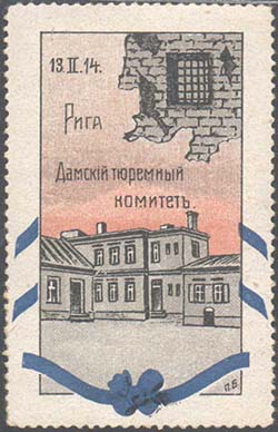 1914 г. Многоцветная печать на серой бумаге с мелованным верхним слоем. Разм. по перфорации 41 х 65 мм. Зубц. 11 1/2. С клеем. В прямоугольной рамке разм. 30,5 х 55 мм изображение здания. В правом верхнем углу фрагмент стены и окно с решеткой. В центре текст в три строки: «Рига. Дамский тюремный комитет». Внизу лента с бантом в центре. В правом нижнем углу аббревиатура из букв «П.Б».