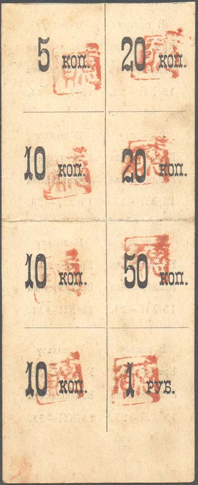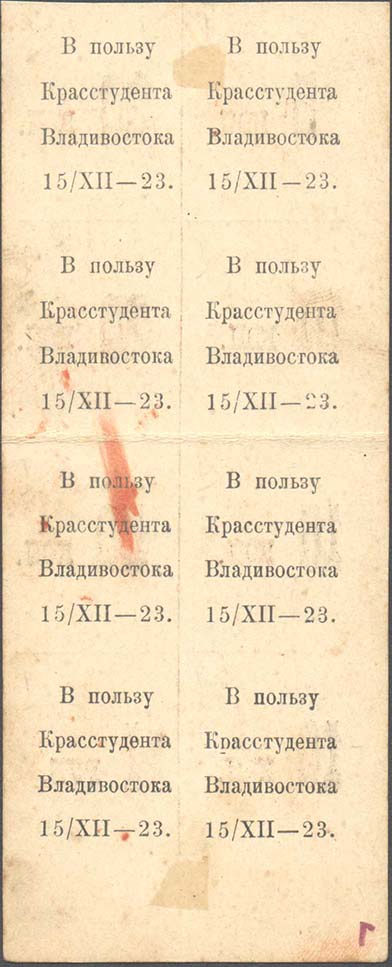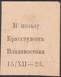 1923 г. 15.12.23 г. Разм. 30 х 36 мм. Одноцветная двухсторонняя печать на толстой белой бумаге. На лицевой стороне текст в четыре строки: «В пользу Красстудента Владивостока 15/12-23». На оборотной стороне номинал и оттиск красного цвета прямоугольного штампа с иероглифами.