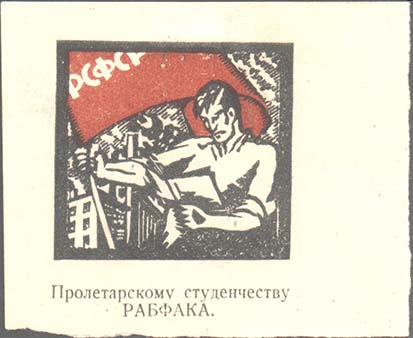 1925(?) г. Разм. 57 х 66 мм. Двухцветная печать на плотной белой глянцевой бумаге. В толстой рамке разм. 36 х 39 мм в центре рабочий с книгой со знаменем с аббревиатурой «РСФСР» на фоне завода. Внизу под рамкой текст в две строки: «Пролетарскому студенчеству РАБФАКа».