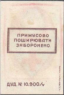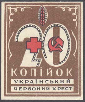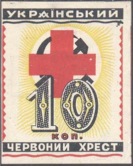 1931 г. Трехцветная и многоцветная двухсторонняя печать на белой бумаге. На лицевой стороне различные рисунки и текст на украинском языке: «Украинский Красный Крест». На оборотной стороне в центре в двойной рамке текст в три строки на украинском языке: «Принудительное распространение запрещено». Внизу выходные данные. Справа мелким шрифтом выходные данные: «Лит. «Красный путь» Харьков».