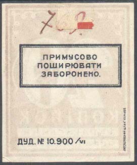 | Разм. 36 х 53 мм. На лицевой стороне в декоративной рамке в центре ромб, на котором сверху номинал в декоративной круглой рамке, внизу красный крест с серпом и молотом. Выходные данные: «ЗАК. № 10.900/V». | |||||